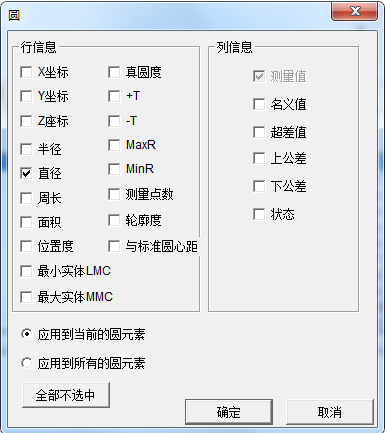 显示各种元素的测量结果﹐其信息量大﹐能满足各种客户的需要。并可设置哪些内容显示,哪些内容不显示﹐也可以单个元素进行单独设置其显示信息。也可对同类元素进行设置,下图是圆元素的显示信息设置对话框。The measurement results of various elements show that they are large enough to meet the needs of various customers. You can also set what displays, what does not appear, or you can set up individual elements to display information. You can also set the similar elements, and the following is the display information settings dialog box of the circle element.