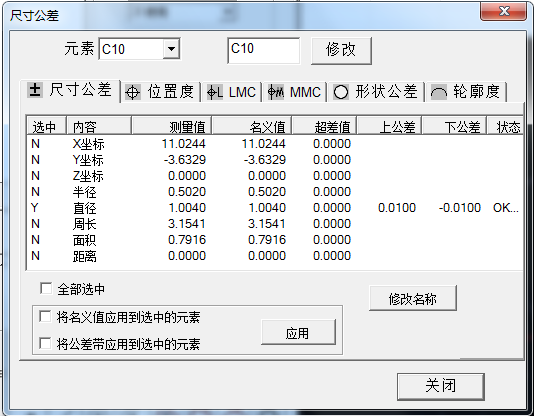 位置公差计算包含位置度、平行度、垂直度、倾斜度及同心度﹐对称度。超差能自动报警,并以红色警示。Positional tolerance calculation includes position, parallelism, perpendicularity, inclination and concentricity, symmetry. The super difference can automatically alarm and red alert.