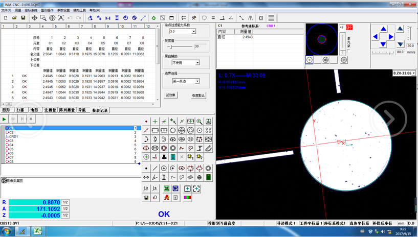 影像自动寻边模式,针对表面影像特点设计不同的寻边模式:普通法,密度法,网板法,包括软件预制的:模式一,模式二,模式三,以及去除人工杂点,除杂点设置:色彩过滤等方法,以便自动测量,准确测量。Image automatic edge searching model,, set different edge models according to image characteristics : normal method, density method, mesh method, including software reset: mode one, mode two, mode three, and the removal of artificial noise and impurity settings: color filter and ect, ensure automatic measurement and accurate measurement.